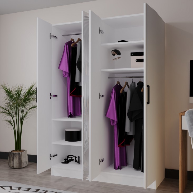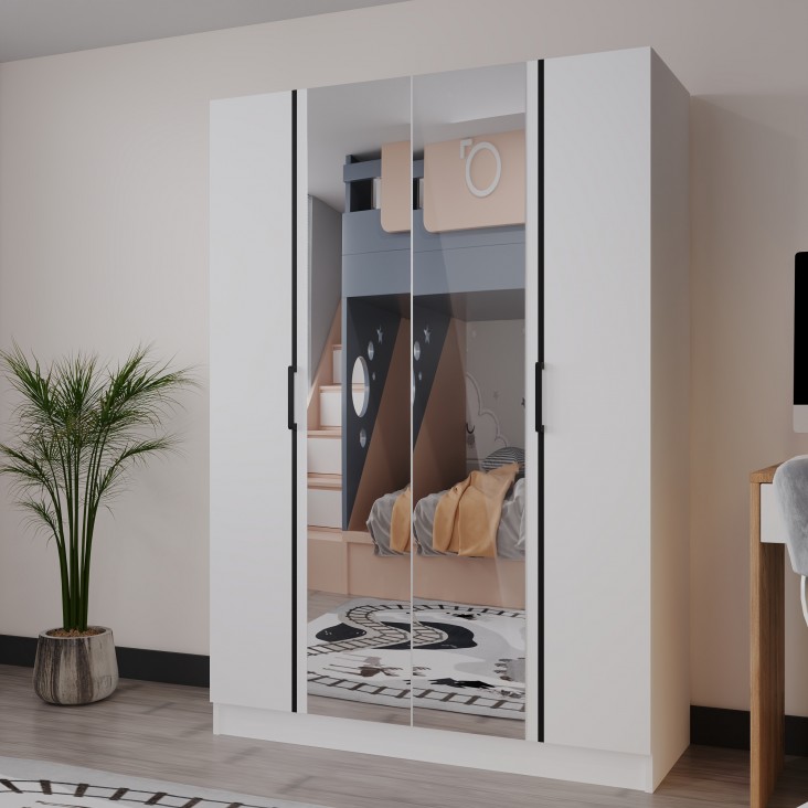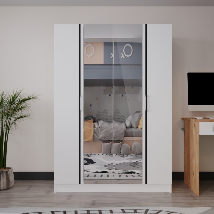 AZZURİ PİYANO 4 Kapaklı Dolap Genç Odası-Çocuk Odası Gardırop Beyaz AYNALI